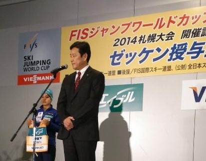 ゼッケンをもらった高梨選手と、日ハム栗山監督。